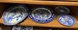Blue and White Platter, Charger, and Plates, platter has crack, Location Right Office 3 Blue and White Platter, Charger, and Plates, platter has crack, Location Right Office 3