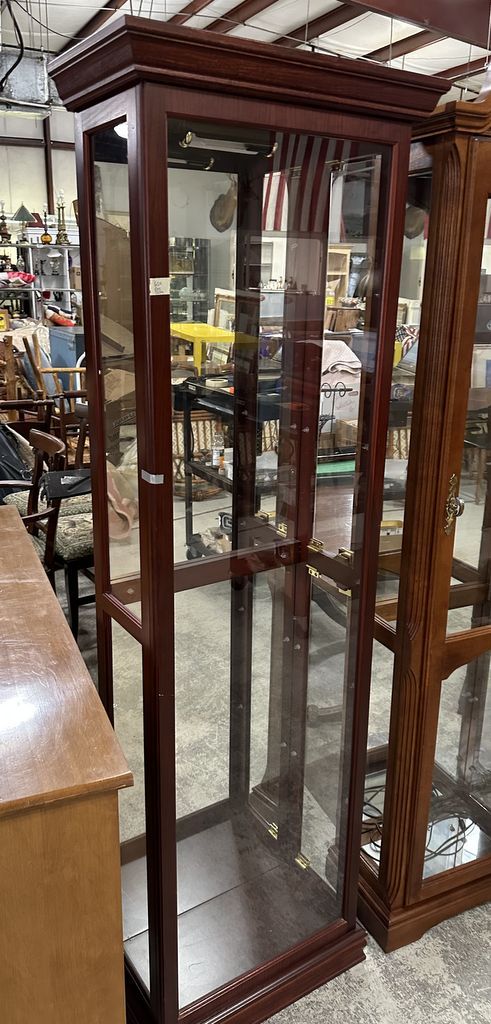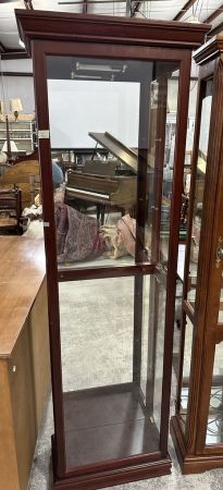 Modern Cherry Display Curio, mirrored back, lighted, glass shelves, 76"h., 21"w. Location Row 3 Modern Cherry Display Curio, mirrored back, lighted, glass shelves, 76"h., 21"w. Location Row 3