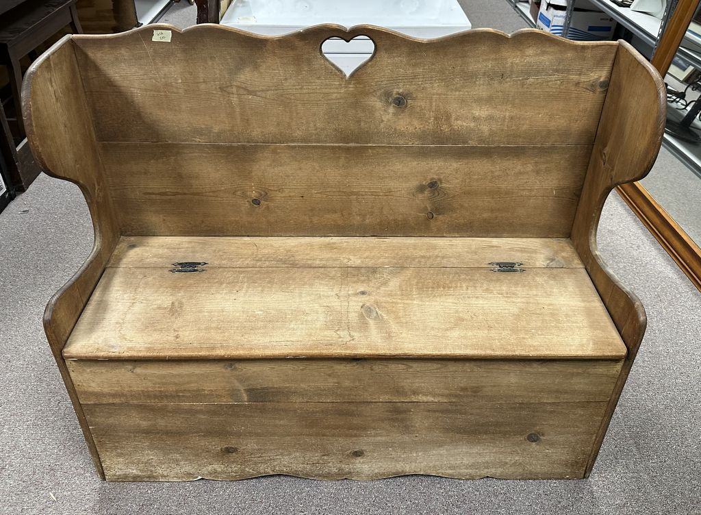 Country Pine Heart Bench, lift top, 38"h., 48"w. Location Right Metal Shelves Country Pine Heart Bench, lift top, 38"h., 48"w. Location Right Metal Shelves