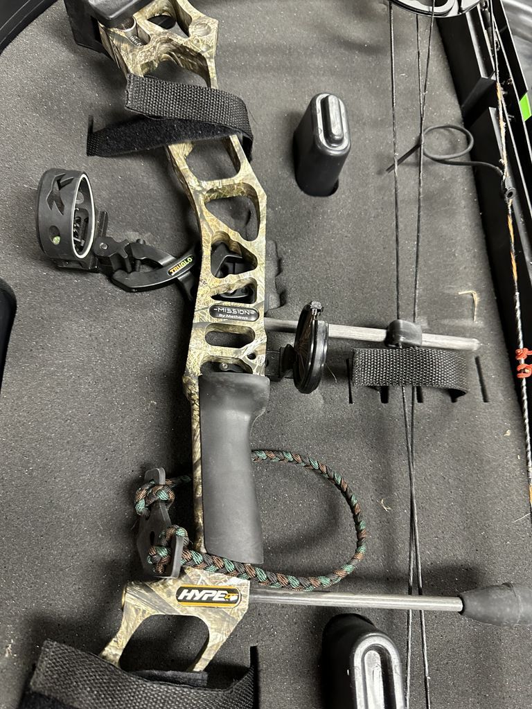 Mission by Mathews Hype Dt Compound Bow, with arrows, and hard case. Location Right Rack Mission by Mathews Hype Dt Compound Bow, with arrows, and hard case. Location Right Rack