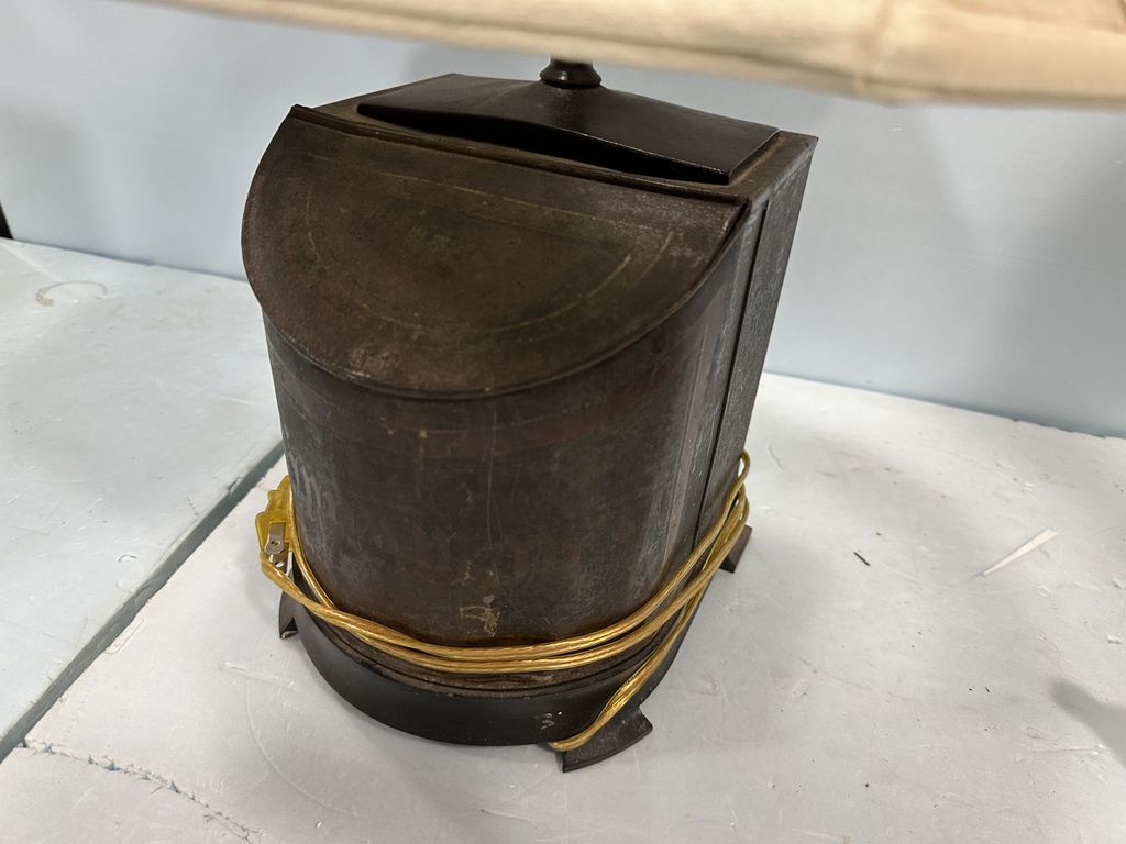 Antique Coffee Tin Lamp, Location Back Metal Shelves Antique Coffee Tin Lamp, Location Back Metal Shelves