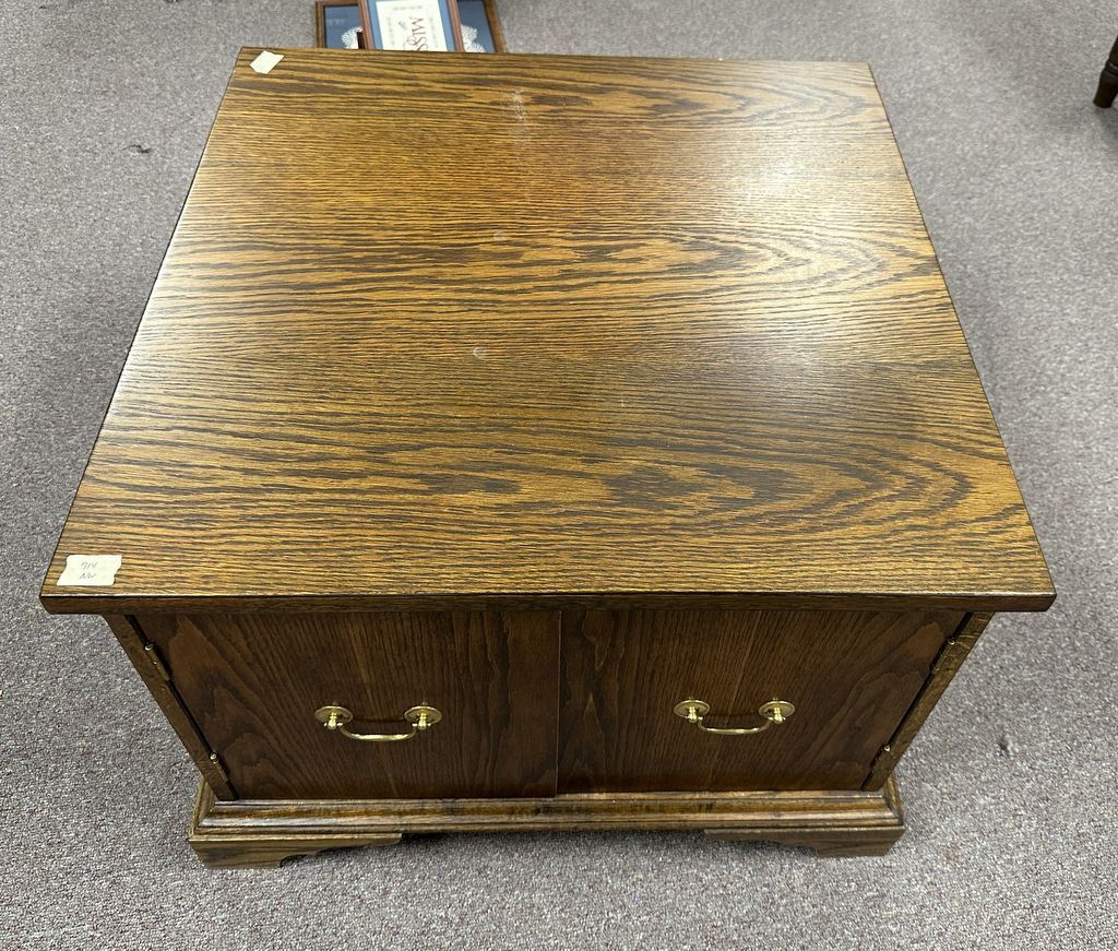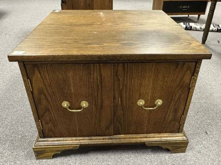 Late 20th Century Oak Lamp Table, two door, 21"h., 28"w. Location Back Metal Shelves Late 20th Century Oak Lamp Table, two door, 21"h., 28"w. Location Back Metal Shelves