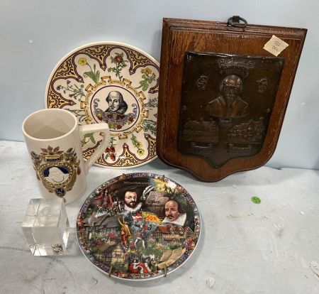 Collection of William Shakespeare, plaque, charger, mug, glass artwork, Location Back Metal Shelves Collection of William Shakespeare, plaque, charger, mug, glass artwork, Location Back Metal Shelves