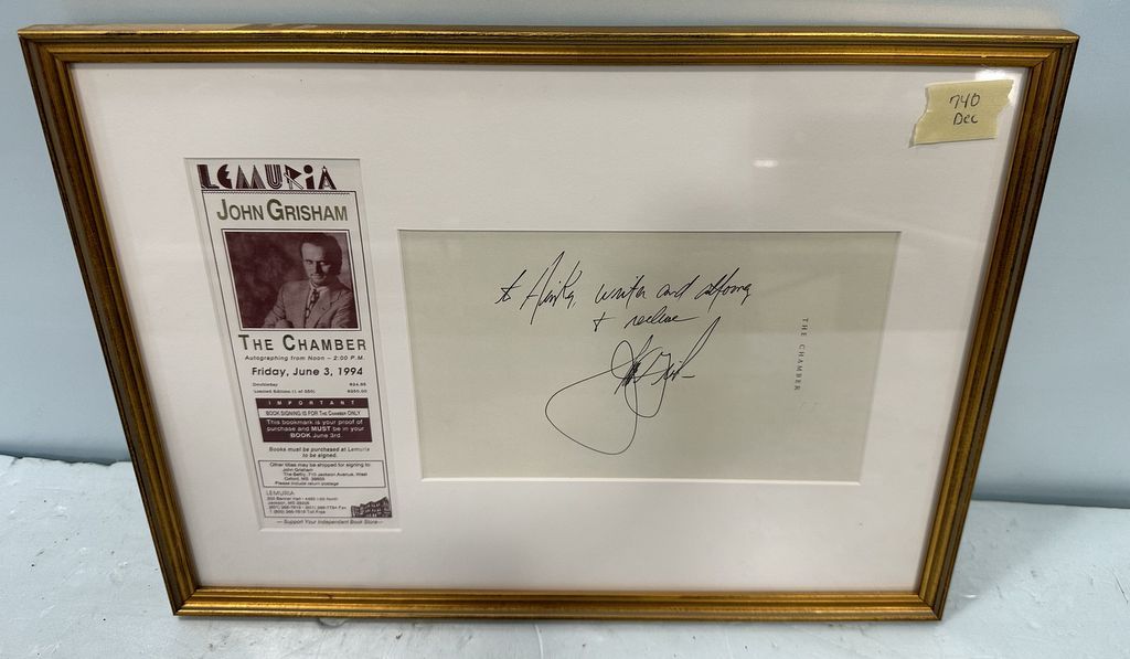 John Grisham Signature, 12"h., 16"w. Location Back Metal Shelves John Grisham Signature, 12"h., 16"w. Location Back Metal Shelves