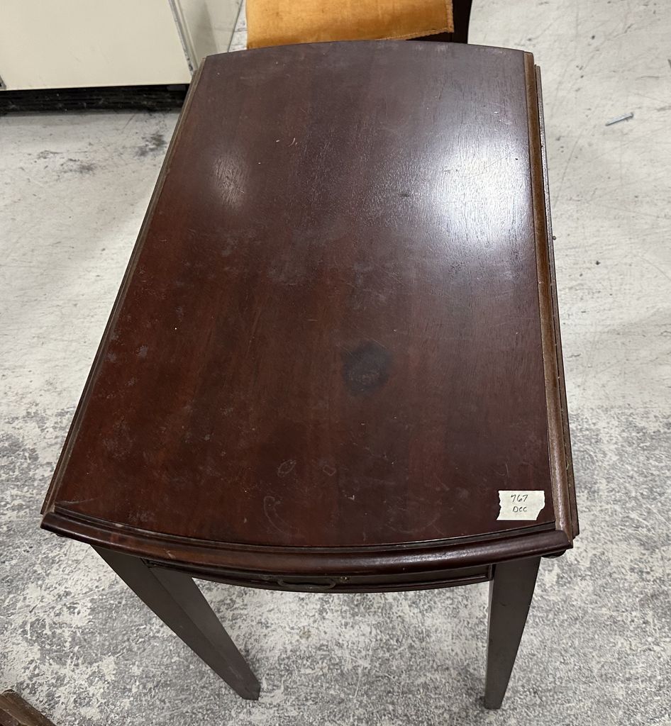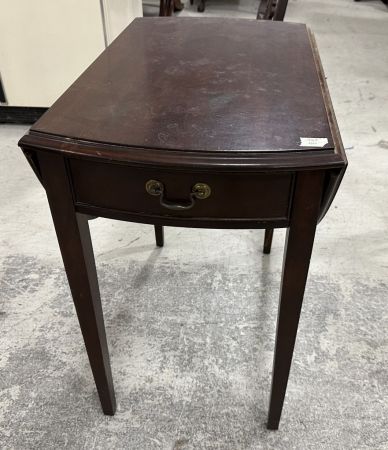 Gordon's Mahogany Traditional Drop Leaf Side Table, single drawer, light wear, 27"h. ,17"w. Location Row 3 Gordon's Mahogany Traditional Drop Leaf Side Table, single drawer, light wear, 27"h. ,17"w. Location Row 3
