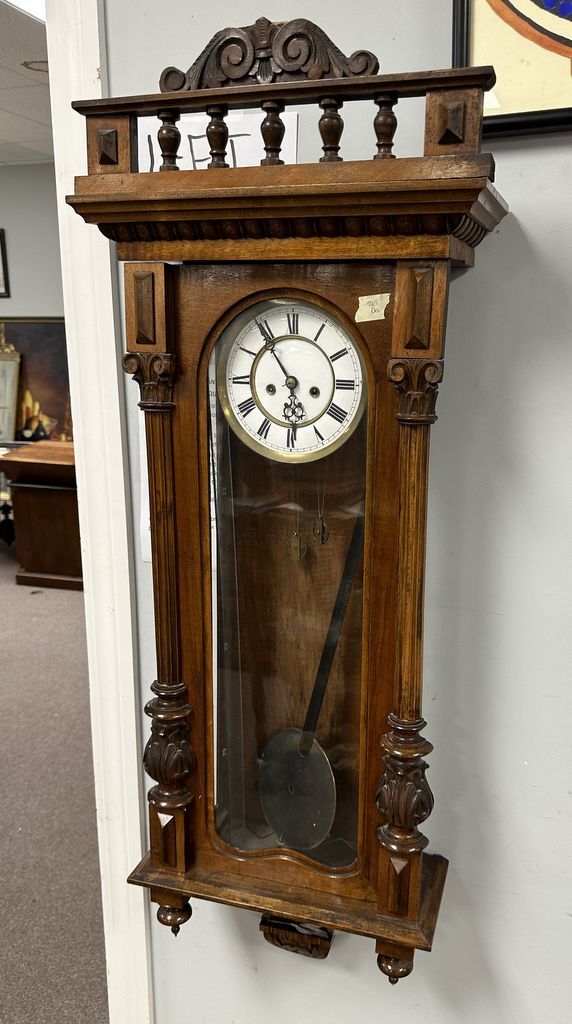 Vintage Victorian Style Wall Clock, needs work, has pendulum and weights, 44"h, Location Left Wall Vintage Victorian Style Wall Clock, needs work, has pendulum and weights, 44"h, Location Left Wall
