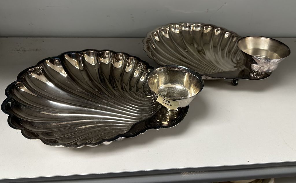 Two Silver Plate Shell Serving Dishes, Location Right Metal Shelves Two Silver Plate Shell Serving Dishes, Location Right Metal Shelves
