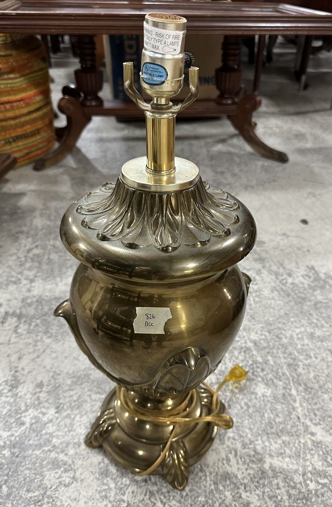 Mid Century Brass Vase Lamp, Location Back Metal Shelves Mid Century Brass Vase Lamp, Location Back Metal Shelves