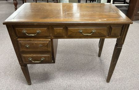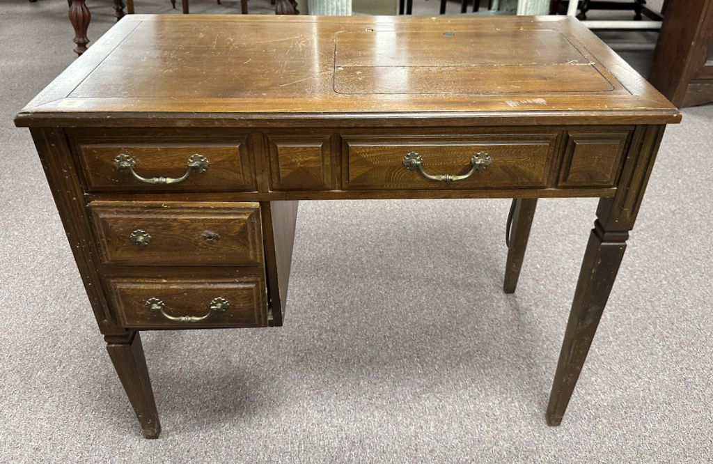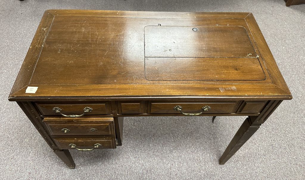 Mid Century Provincial Style Sewing Cabinet, no machine, worn condition, 29"h., 36"w. Location Row 5 Mid Century Provincial Style Sewing Cabinet, no machine, worn condition, 29"h., 36"w. Location Row 5
