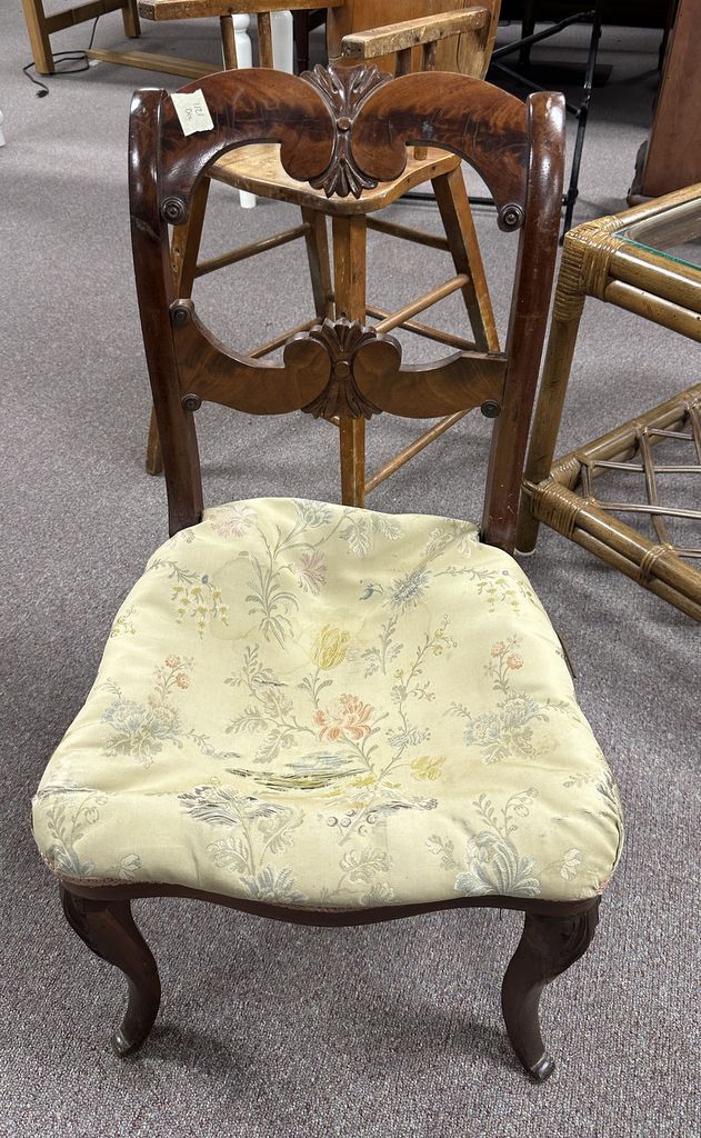 Antique Flame Mahogany Side Chair, worn out seat, Location Left Office 1 Antique Flame Mahogany Side Chair, worn out seat, Location Left Office 1