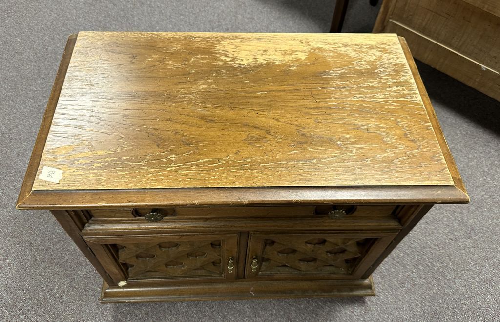 1970's Italian Renaissance Nightstand, worn finish, 24"h., 29"w. Location Row 4 1970's Italian Renaissance Nightstand, worn finish, 24"h., 29"w. Location Row 4