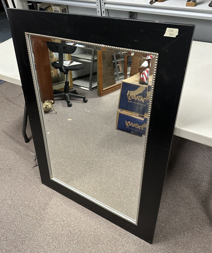 Modern Black Framed Beveled Wall Mirror, 43"h., 31"w. Modern Black Framed Beveled Wall Mirror, 43"h., 31"w.