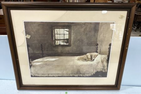 Framed Print of Bedroom, damaged glass, 28"h., 34"w. Location Back Wall Framed Print of Bedroom, damaged glass, 28"h., 34"w. Location Back Wall