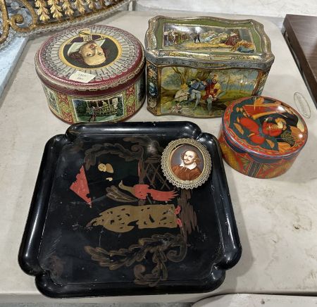 Collection of Vintage Tins and Black Tray , Location Back Metal Shelves Collection of Vintage Tins and Black Tray , Location Back Metal Shelves