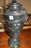 Black Metal Vases with Rams Heads and marble bases - made into lamps; 30" h. Black Metal Vases with Rams Heads and marble bases - made into lamps; 30" h.