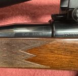 Make: Parker-Hale Ltd., Birmingham, England (imported to the U.S.) Model: Likely from the Parker-Hale 1000 or 1200 series (based on style and markings) Caliber: .30-06 Springfield. Receiver: Serial number P-71229 Barrel: Serial number 220050 Barrel markings include “Parker-Hale Ltd. Birmingham, England” and import marks for Tec-Hu, Austin, TX (indicating the importer for the U.S. market). Action: Bolt-action with internal magazine, hinged floorplate Stock: Gloss-finished walnut stock with skip-line checkering on forearm and grip Buttpad: Vented recoil pad Scope: Modern riflescope mounted (brand not specified in close-up images), variable power, matte finish Barrel: Blued steel with iron sights removed or absent (scope-mounted configuration) Barrel Image with engravings reads: Parker Gallard, Inc, Wilmington, DE. Parker-Hale rifles of this style were well-regarded for their Mauser-style action, quality British walnut stocks, and accuracy for big game hunting. Make: Parker-Hale Ltd., Birmingham, England (imported to the U.S.) Model: Likely from the Parker-Hale 1000 or 1200 series (based on style and markings) Caliber: .30-06 Springfield. Receiver: Serial number P-71229 Barrel: Serial number 220050 Barrel markings include “Parker-Hale Ltd. Birmingham, England” and import marks for Tec-Hu, Austin, TX (indicating the importer for the U.S. market). Action: Bolt-action with internal magazine, hinged floorplate Stock: Gloss-finished walnut stock with skip-line checkering on forearm and grip Buttpad: Vented recoil pad Scope: Modern riflescope mounted (brand not specified in close-up images), variable power, matte finish Barrel: Blued steel with iron sights removed or absent (scope-mounted configuration) Barrel Image with engravings reads: Parker Gallard, Inc, Wilmington, DE. Parker-Hale rifles of this style were well-regarded for their Mauser-style action, quality British walnut stocks, and accuracy for big game hunting.