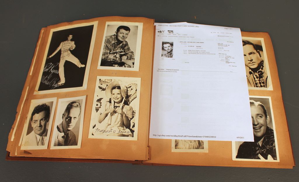 RARE FIND. Movie Star Scrapbook; with signed photos of many actors and actresses in the beginning of their career. Some which to appear to be original photos and autograph are: Lana Turner (1921-1995), Good Luck Gene Kelly (1912-1996), "Thanks for the Memory" Bob Hope (1903-2003), "Regards" John Lund (1911-1992), "Be Happy" Ella Mae Morse (1924-1999), "My Best Always" Perry Como (1912-2001) RARE FIND. Movie Star Scrapbook; with signed photos of many actors and actresses in the beginning of their career. Some which to appear to be original photos and autograph are: Lana Turner (1921-1995), Good Luck Gene Kelly (1912-1996), "Thanks for the Memory" Bob Hope (1903-2003), "Regards" John Lund (1911-1992), "Be Happy" Ella Mae Morse (1924-1999), "My Best Always" Perry Como (1912-2001)