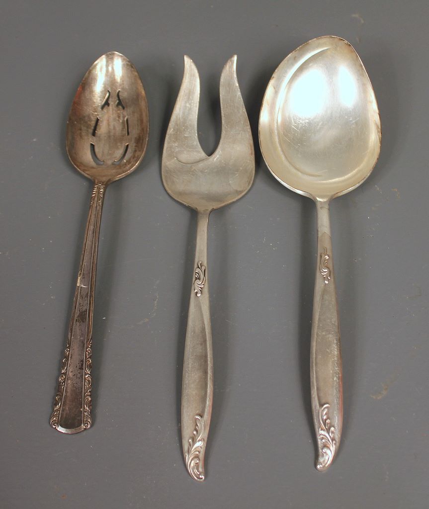 Three Pieces of Holmes and Edwards Silverplate, Holmes and Edwards May Queen Silverplate serving salad spoon and fork, 9" l. Holmes and Edwards International Silver deep silver serving spoon, 8 1/4" l. Three Pieces of Holmes and Edwards Silverplate, Holmes and Edwards May Queen Silverplate serving salad spoon and fork, 9" l. Holmes and Edwards International Silver deep silver serving spoon, 8 1/4" l.