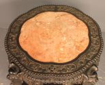 Carved Teakwood Oriental Table, 20th century heavily carved oriental table with brown inset marble, carved scallop and beaded edge, dragon heads, legs end in carved feet; 22" dia., 23" h. Carved Teakwood Oriental Table, 20th century heavily carved oriental table with brown inset marble, carved scallop and beaded edge, dragon heads, legs end in carved feet; 22" dia., 23" h.
