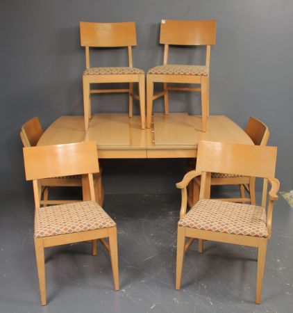 Mid 20th Century Table and Six Chairs, blonde wood table with two leaves and six chairs. One arm, five side chairs, 32 1/2" h., 18 1/2" w.; table 59" w., 40" d., 30" h., leaves 12" w. Mid 20th Century Table and Six Chairs, blonde wood table with two leaves and six chairs. One arm, five side chairs, 32 1/2" h., 18 1/2" w.; table 59" w., 40" d., 30" h., leaves 12" w.