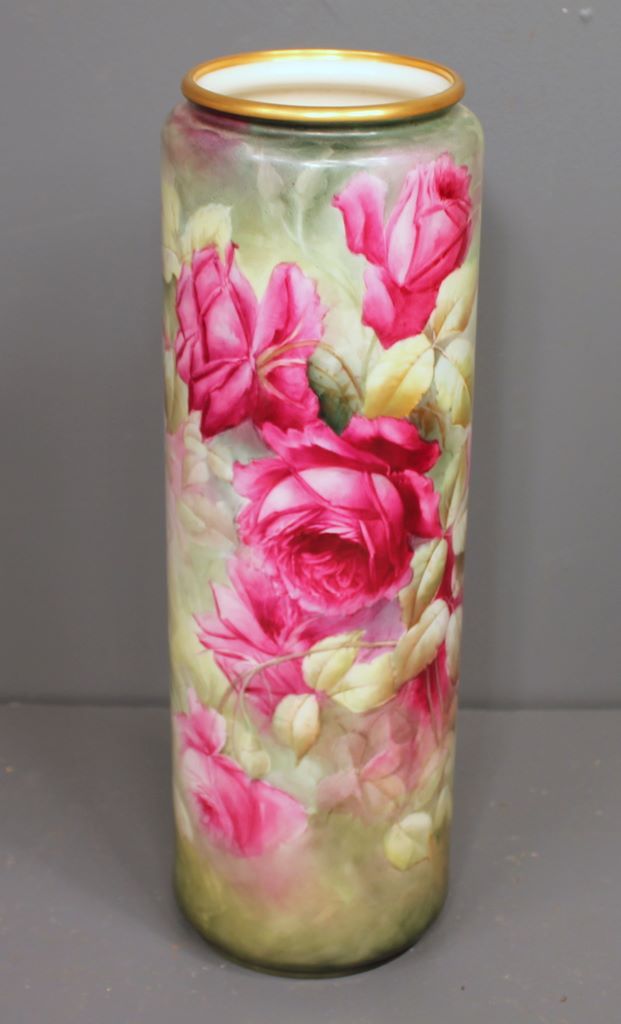 RARE Willets Hand Painted Vase, hard to find large hand painted porcelain vase with beautiful pink roses, green ground color, gold trim on lip. Marked - brown Belleek, Willets; 15 1/2" h., 5 1/2" dia. RARE Willets Hand Painted Vase, hard to find large hand painted porcelain vase with beautiful pink roses, green ground color, gold trim on lip. Marked - brown Belleek, Willets; 15 1/2" h., 5 1/2" dia.