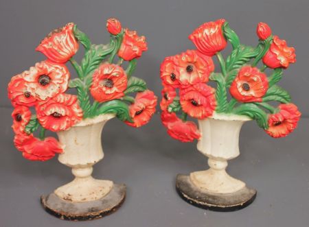 Pair of Victorian Iron Doorstops, hand painted baskets design, original paint; 11" h., 7" w. Pair of Victorian Iron Doorstops, hand painted baskets design, original paint; 11" h., 7" w.