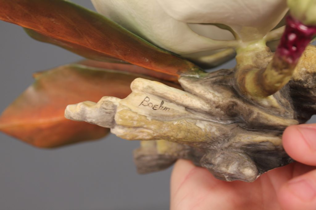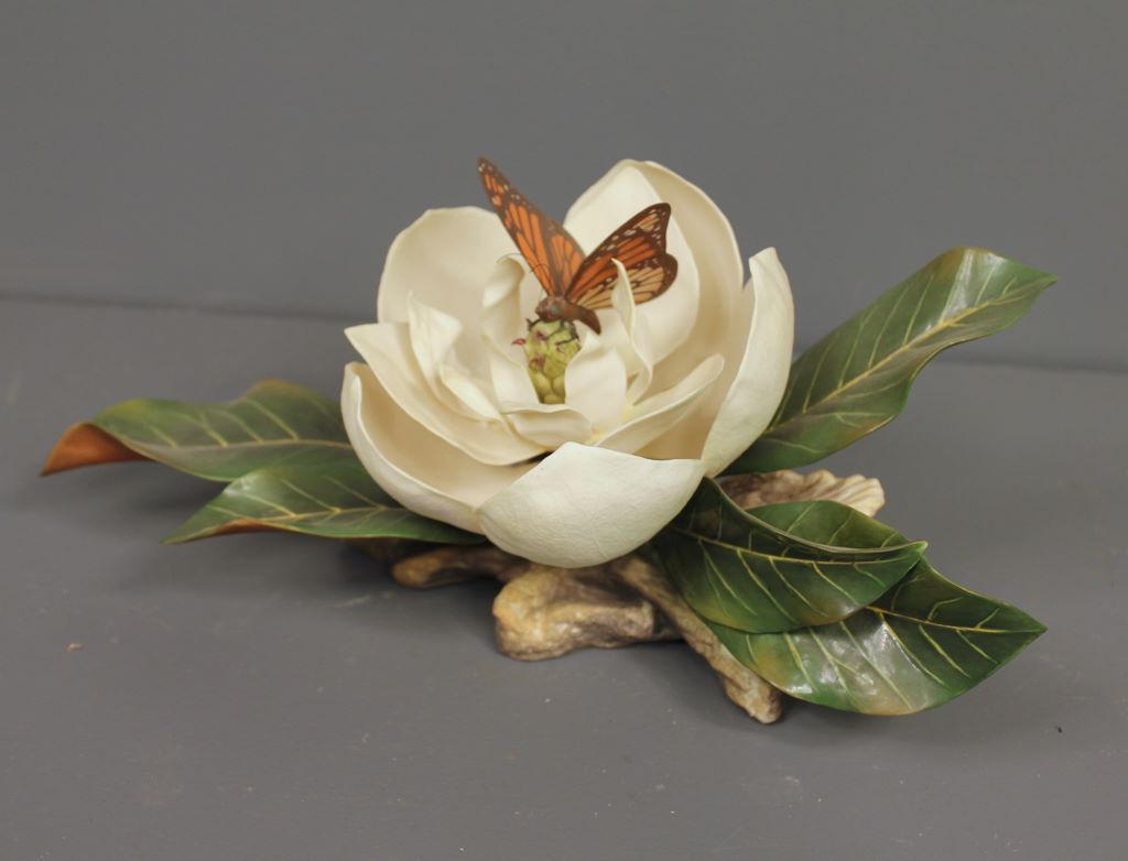 Limited Edition Boehm Magnolia, with butterfly #632; 13" w., 5 1/2" h. (two leaves have been reglued) Limited Edition Boehm Magnolia, with butterfly #632; 13" w., 5 1/2" h. (two leaves have been reglued)