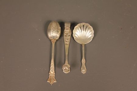 Three Pieces of Sterling Silver, sterling sugar tongs with rose motif 4 3/8", international sterling jelly spoon pattern Joan of Ark 4 1/2", tea strainer by Frank Whiting 5 1/2" Three Pieces of Sterling Silver, sterling sugar tongs with rose motif 4 3/8", international sterling jelly spoon pattern Joan of Ark 4 1/2", tea strainer by Frank Whiting 5 1/2"