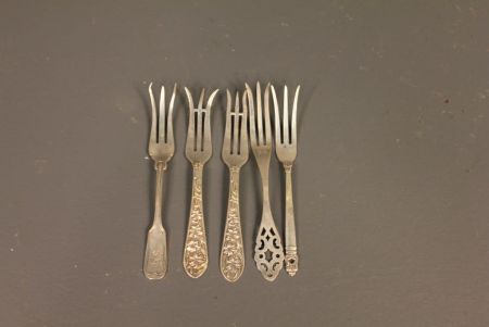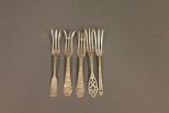 Five Sterling Forks, consisting of two Frank Whiting dessert forks with lilies 4 1/2", three lemon forks, one with monogram 5" Five Sterling Forks, consisting of two Frank Whiting dessert forks with lilies 4 1/2", three lemon forks, one with monogram 5"