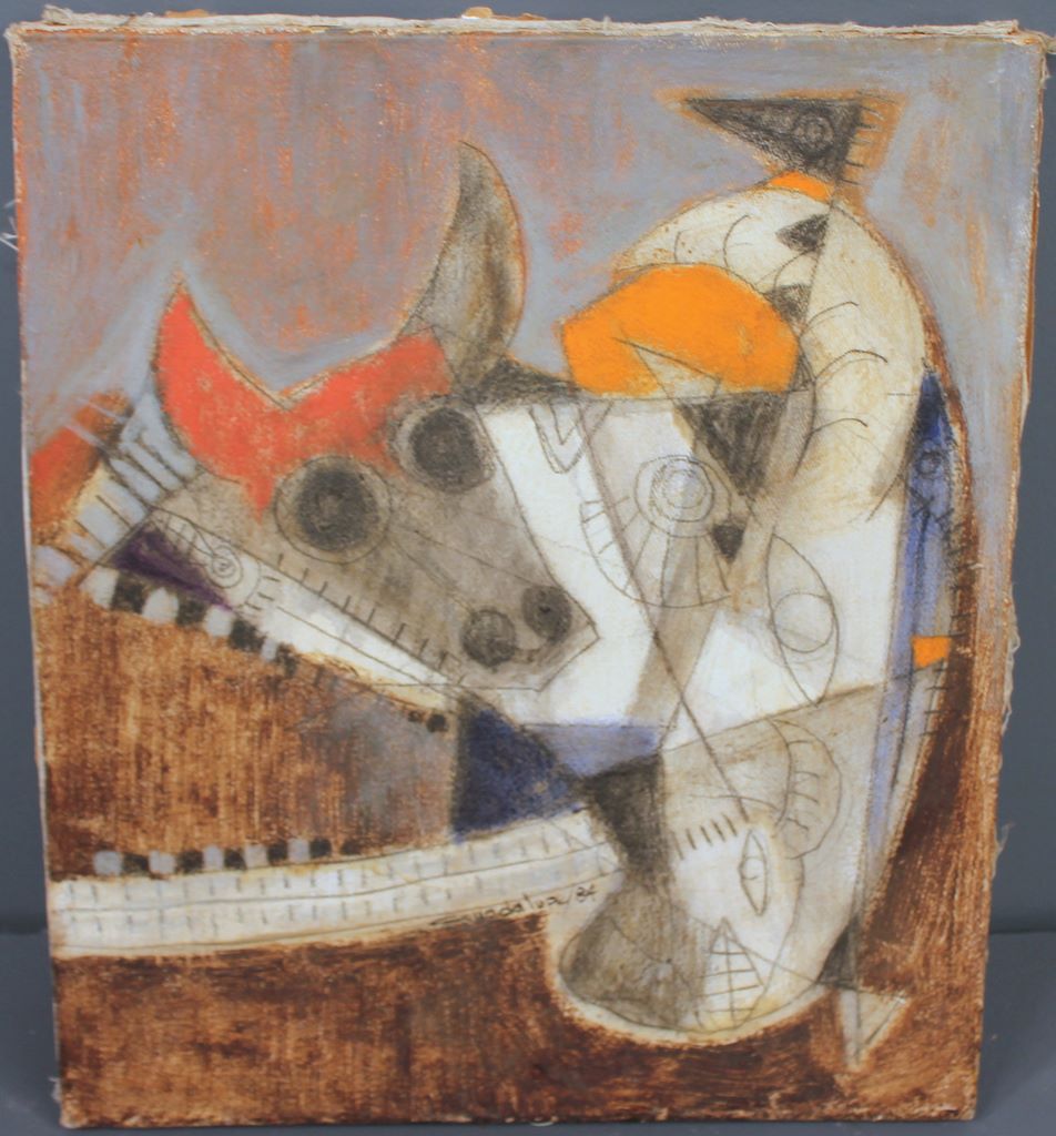 Mixed Media Painting, in Picasso style of bull and deer, signed Guadalupe '84, unframed; 12" w., 14" h. Mixed Media Painting, in Picasso style of bull and deer, signed Guadalupe '84, unframed; 12" w., 14" h.
