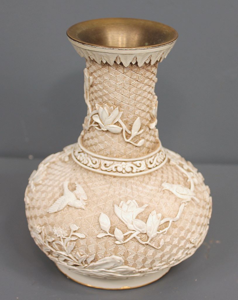 Ivory or Bone Dynasty Vase, brass vase with carved ivory birds and trees, made by Arnat Imports from Ivory Dynasty Collection; 7 1/2" h., 5" dia. Ivory or Bone Dynasty Vase, brass vase with carved ivory birds and trees, made by Arnat Imports from Ivory Dynasty Collection; 7 1/2" h., 5" dia.