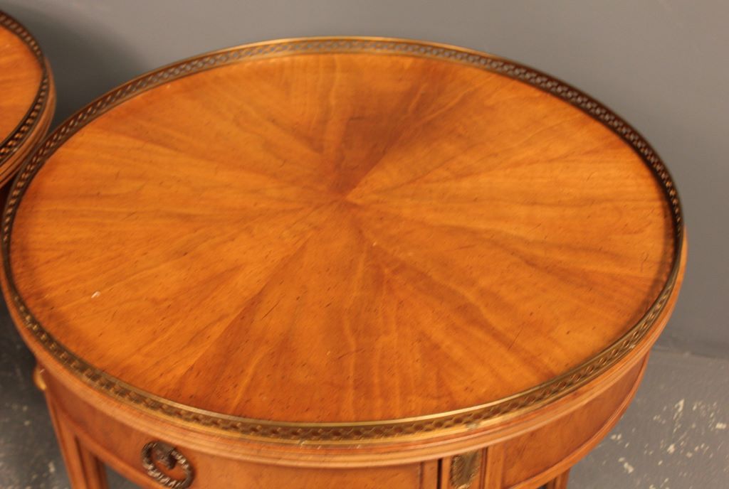 Pair of Round Henredon Tables with Brass Gallery, with fancy veneer tops, shelf and single drawer; 24" h., 26 1/2" dia. Pair of Round Henredon Tables with Brass Gallery, with fancy veneer tops, shelf and single drawer; 24" h., 26 1/2" dia.