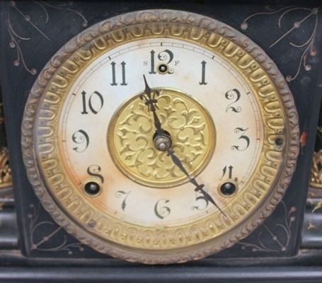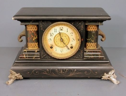 Haven Clock Company 20th Century Mantel Clock, black laquer over wood with gilt trimmings, glass door, brass surrounding dial with black roman numerals; 18' h., 12' w. Haven Clock Company 20th Century Mantel Clock, black laquer over wood with gilt trimmings, glass door, brass surrounding dial with black roman numerals; 18' h., 12' w.