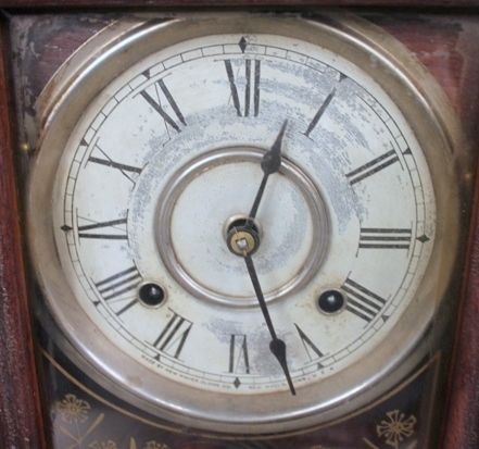Ornate Victorian Style Oak Mantel Clock by New Haven, 20th century or late 19th century, with glass door which has gold floral decoration, black roman numerals on dial; 21 1/2' h., 14" w. Ornate Victorian Style Oak Mantel Clock by New Haven, 20th century or late 19th century, with glass door which has gold floral decoration, black roman numerals on dial; 21 1/2' h., 14" w.
