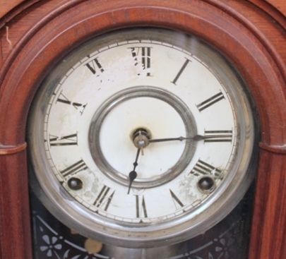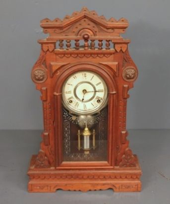 Bengal Mantel Clock, late 19th century heavily carved case, glass door having gold decoration, gothic style pendulum, by f. koreber, New York, 8 day strike; 21" h., 14" w. Bengal Mantel Clock, late 19th century heavily carved case, glass door having gold decoration, gothic style pendulum, by f. koreber, New York, 8 day strike; 21" h., 14" w.