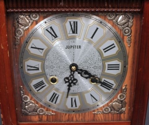 Vintage Mantel Clock, in the style of an old mantel clock, made in Korea, Jupiter, 30 day, large pendulum, wood case; 24 1/2" h., 11 1/2" w. Vintage Mantel Clock, in the style of an old mantel clock, made in Korea, Jupiter, 30 day, large pendulum, wood case; 24 1/2" h., 11 1/2" w.