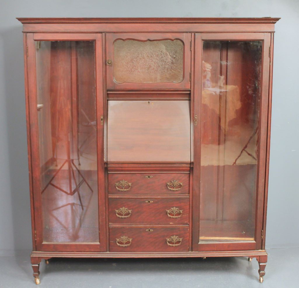 20th century Mahogany Fall Front Secretary/Bookcase; with fall front desk in center with three drawers, mirrored door and two glass doors; 63" h., 59" w., 14" d. 20th century Mahogany Fall Front Secretary/Bookcase; with fall front desk in center with three drawers, mirrored door and two glass doors; 63" h., 59" w., 14" d.