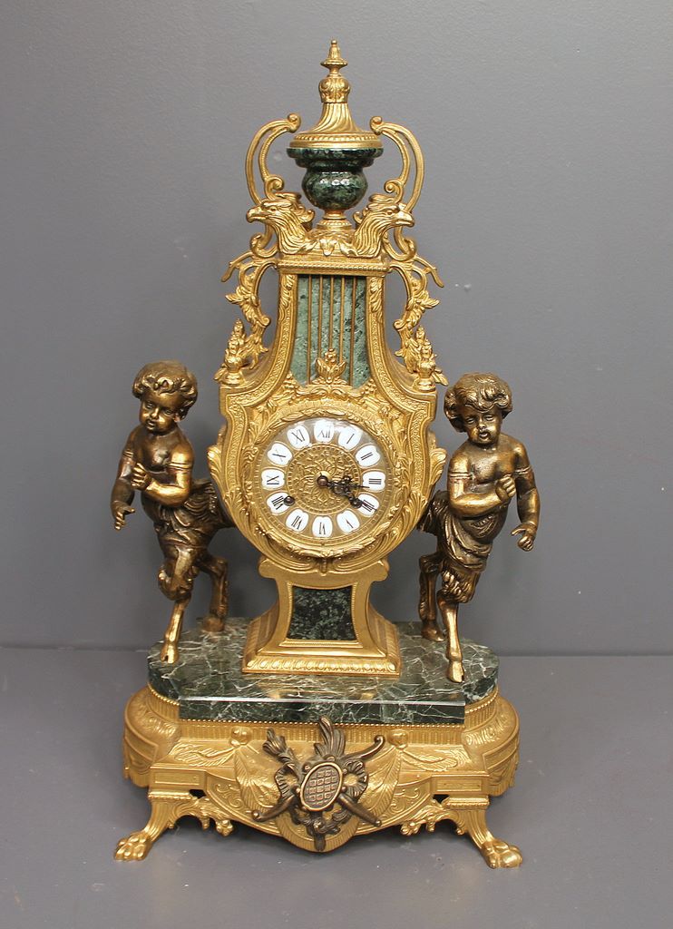 Monumental French Style Brass and Marble Rococo Mantel Clock. Harp shape center with urn and birds, standing cupids, marble and brass base with paw feet; 24" h., 13" w. Monumental French Style Brass and Marble Rococo Mantel Clock. Harp shape center with urn and birds, standing cupids, marble and brass base with paw feet; 24" h., 13" w.