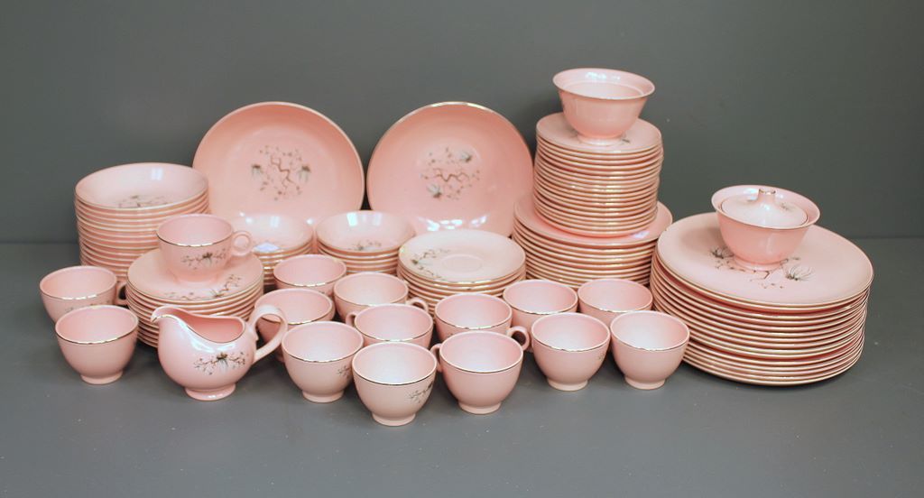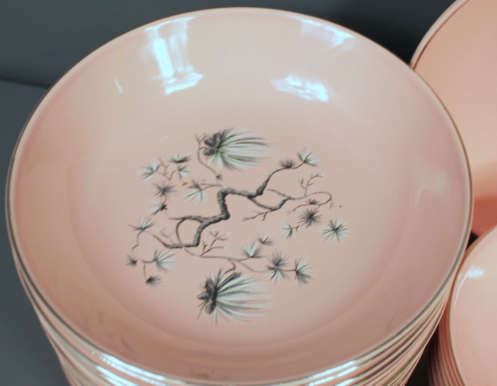 Taylor Smith Taylor Dwarf Pine Dinnerware, retro pink dwarf pine dinnerware from the 1950's. Oven proof decorated with drawing of twisted pine branch with pine needles and cones, silver trim set consist of fifteen 10" dinner plates (two with chips), fifteen 8 1/4" luncheon plates, eighteen 6 1/4" bread and butter plates (one with chip), fifteen 6 3/8" cereal bowls (two with chips), two 9" vegetable bowls, fourteen 5 1/4" fruit bowls (two with chips), twenty one 6 1/2" saucers (five chipped), fifteen cups (two with chips) creamer, two sugars (one missing a lid). Sixty seven total pieces. Taylor Smith Taylor Dwarf Pine Dinnerware, retro pink dwarf pine dinnerware from the 1950's. Oven proof decorated with drawing of twisted pine branch with pine needles and cones, silver trim set consist of fifteen 10" dinner plates (two with chips), fifteen 8 1/4" luncheon plates, eighteen 6 1/4" bread and butter plates (one with chip), fifteen 6 3/8" cereal bowls (two with chips), two 9" vegetable bowls, fourteen 5 1/4" fruit bowls (two with chips), twenty one 6 1/2" saucers (five chipped), fifteen cups (two with chips) creamer, two sugars (one missing a lid). Sixty seven total pieces.