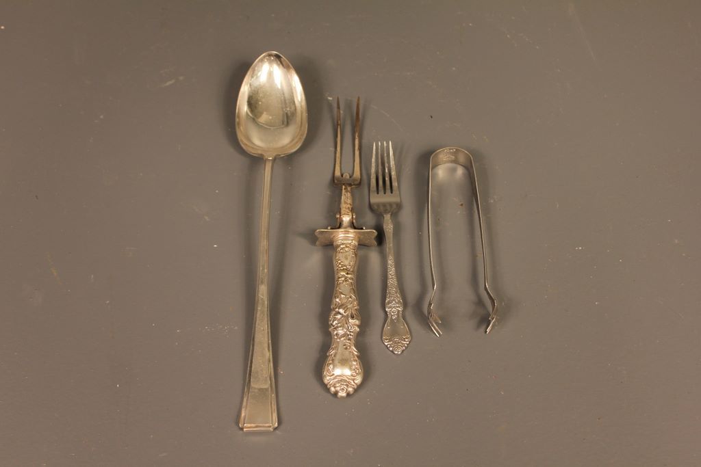 Four Silverplate Pieces, large Sheffield plate spoon 13" l., carving fork 10 1/2" l., aluminum stainless steel tongs 6" l., dinner fork 7" l. Four Silverplate Pieces, large Sheffield plate spoon 13" l., carving fork 10 1/2" l., aluminum stainless steel tongs 6" l., dinner fork 7" l.