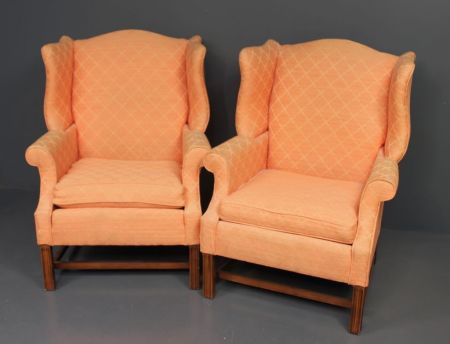 Pair of vintage wing back chairs, covered in worn apricot fabric; 40" h., 31" w., 22" d. Pair of vintage wing back chairs, covered in worn apricot fabric; 40" h., 31" w., 22" d.
