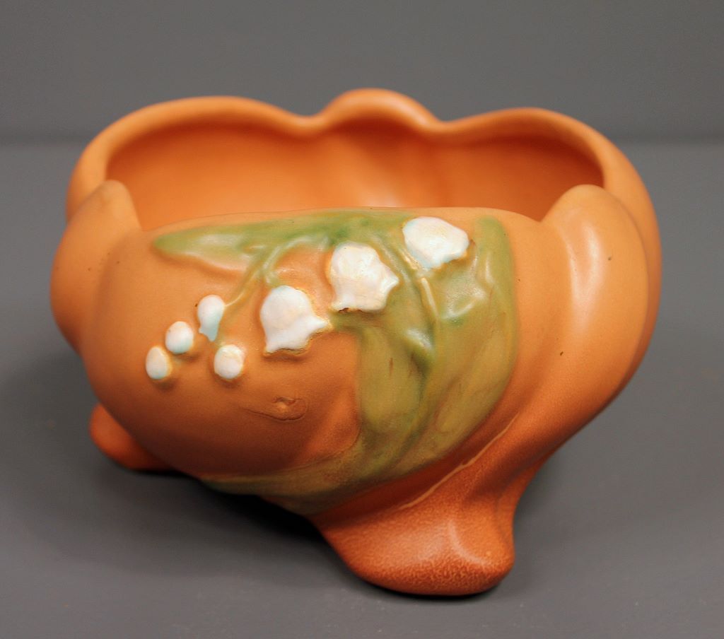 American Pottery Vase, brown ground color with white bell flowers, three footed, no mark; 6" dia., 3 1/2" h. American Pottery Vase, brown ground color with white bell flowers, three footed, no mark; 6" dia., 3 1/2" h.