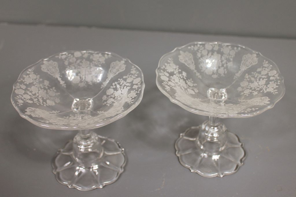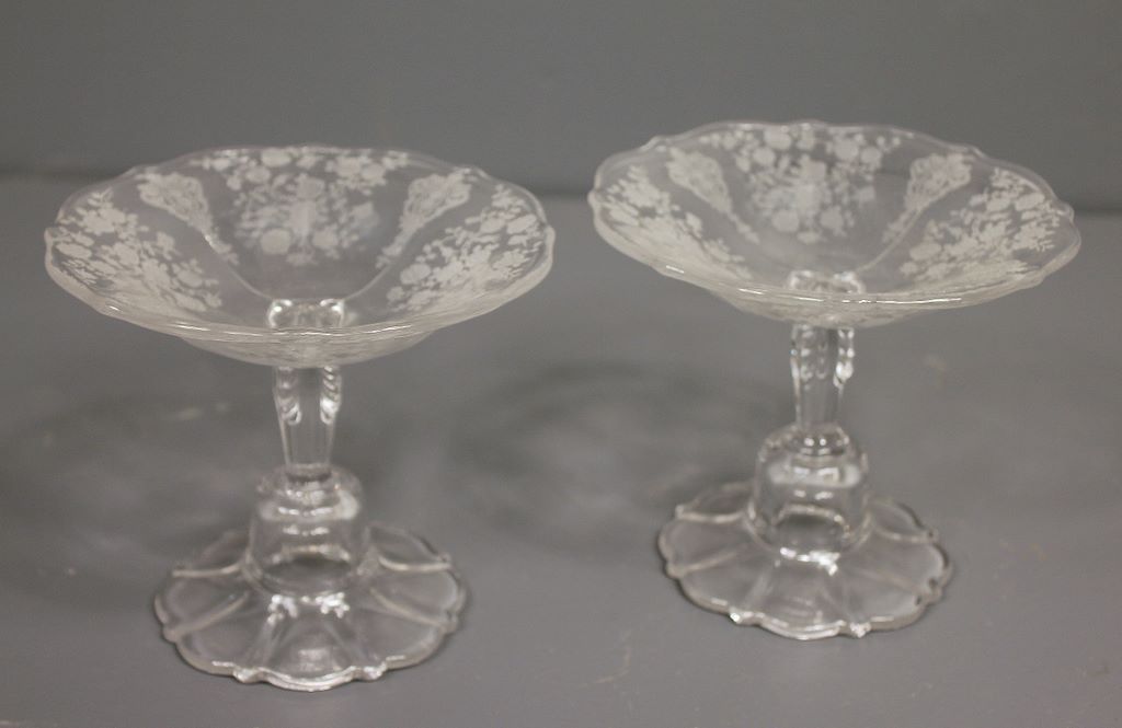 Pair of Cambridge Glass Compotes, Rosepoint pattern compotes; 4 1/2" h., 5' dia. Pair of Cambridge Glass Compotes, Rosepoint pattern compotes; 4 1/2" h., 5' dia.