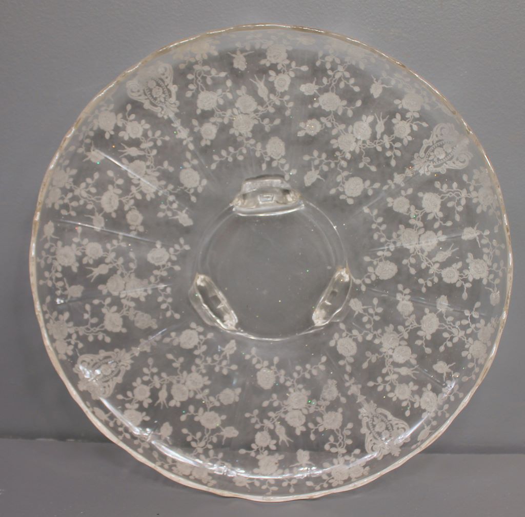 Cambridge Glass Serving Tray, rosepoint pattern, three footed serving tray; 13" dia., 2" h. Cambridge Glass Serving Tray, rosepoint pattern, three footed serving tray; 13" dia., 2" h.