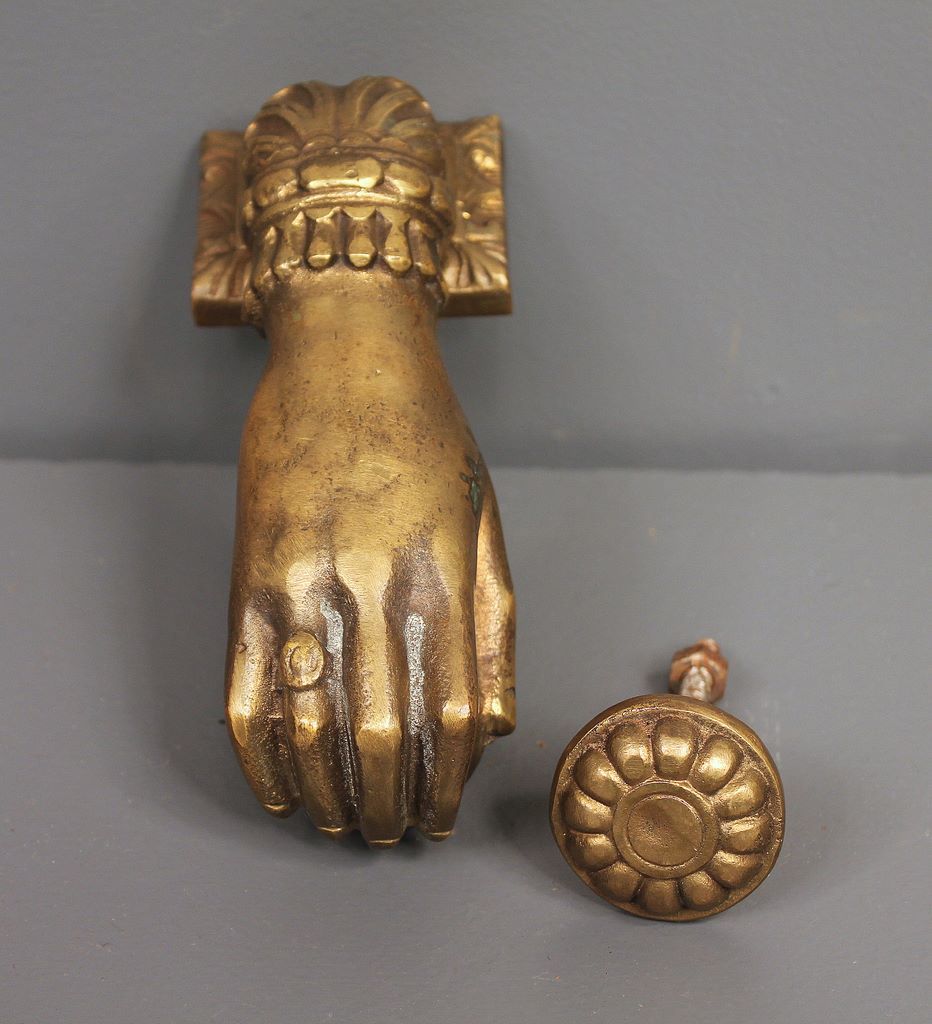 Victorian Brass Hand Door Knocker, in shape of hand holding a ball, Victorian hand with sleeve cuff and ring; 6 1/2" w., 2 1/2" h. Victorian Brass Hand Door Knocker, in shape of hand holding a ball, Victorian hand with sleeve cuff and ring; 6 1/2" w., 2 1/2" h.