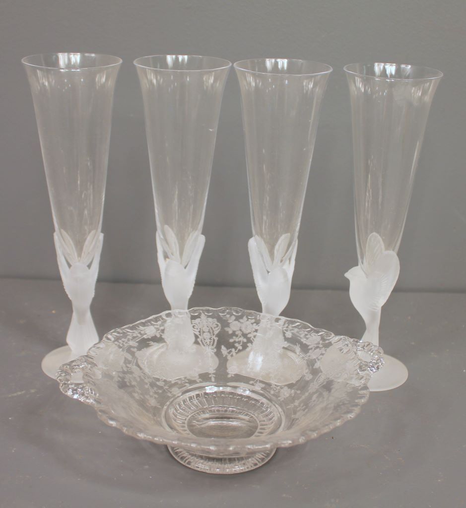 Sasaki Crystal "Wings" Candlesticks, base in form of bird 9 1/2" h., 2 1/4" dia., Cambridge glass two handle bowl 8 1/2" dia., 2 1/2" h. Sasaki Crystal "Wings" Candlesticks, base in form of bird 9 1/2" h., 2 1/4" dia., Cambridge glass two handle bowl 8 1/2" dia., 2 1/2" h.