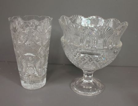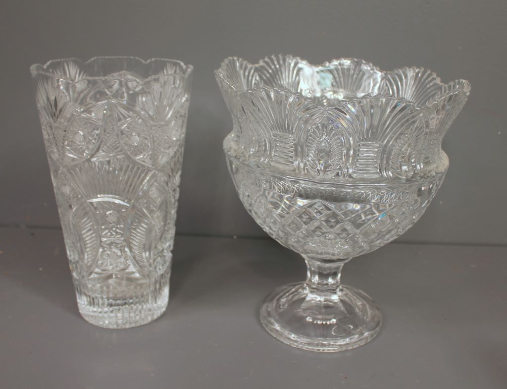 Two Crystal Pieces, large vase (11 1/2" h., 6 1/2" dia.) and punch bowl (11 1/2" h., 10" dia.) Two Crystal Pieces, large vase (11 1/2" h., 6 1/2" dia.) and punch bowl (11 1/2" h., 10" dia.)