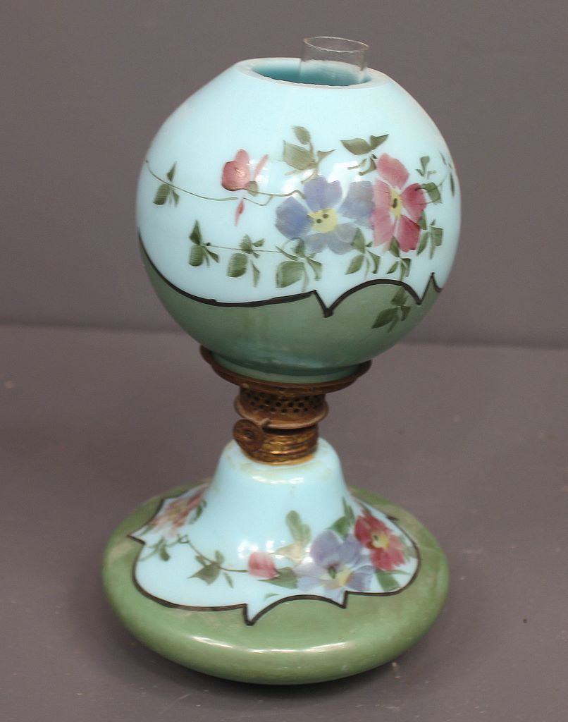 Miniature Glass Oil Lamp, in the Gone with the Wind Style, hand painted 9" h., 5" dia. Miniature Glass Oil Lamp, in the Gone with the Wind Style, hand painted 9" h., 5" dia.