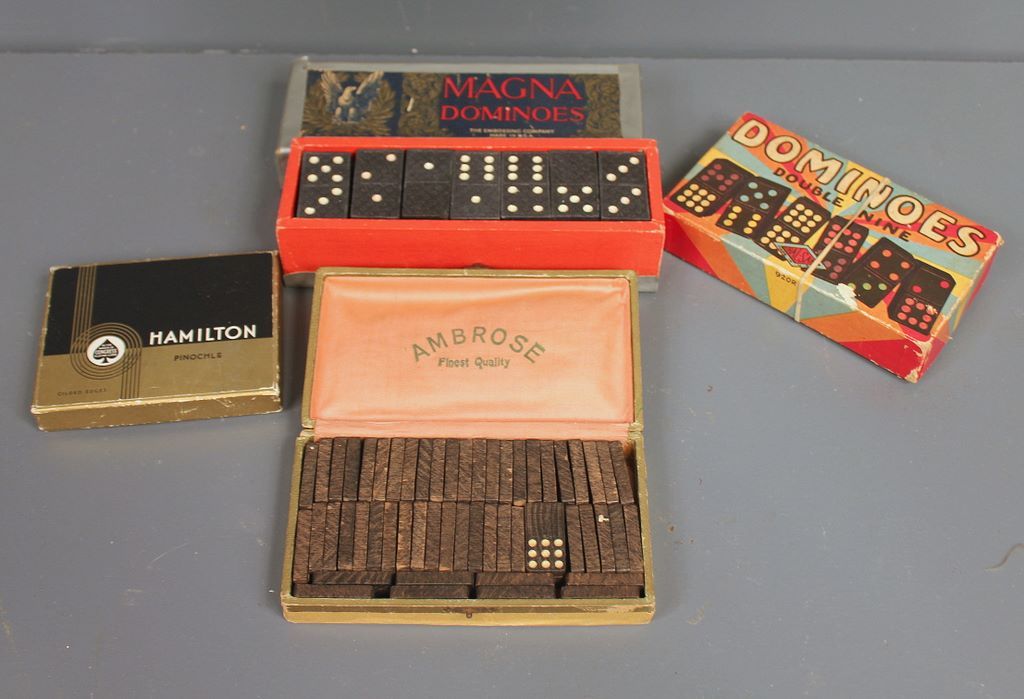 Collection of Three Vintage Dominoes Set; Ambose set in original box, Haisan set in original box, Magna in original box and particle set of cards Collection of Three Vintage Dominoes Set; Ambose set in original box, Haisan set in original box, Magna in original box and particle set of cards