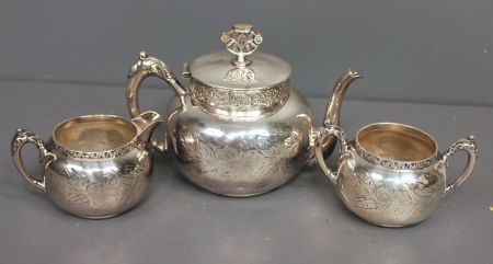 Three Piece Triple Plate Tea Set. Esthetic Movement design, etched flowers tea pot. 6"h., sugar and creamer 3 1/4"h. Three Piece Triple Plate Tea Set. Esthetic Movement design, etched flowers tea pot. 6"h., sugar and creamer 3 1/4"h.